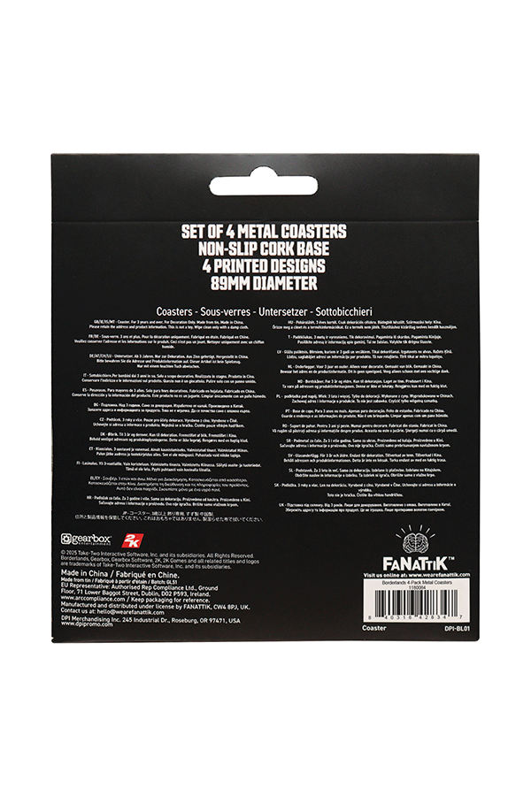Enjoy a taste of Pandora with every drink! The Borderlands 4-Pack Metal Coasters is an essential set of barware for Vault Hunters. On the bottom is an anti-slip cork base, and on top is a tin surface printed with artwork from the world of Borderlands. What drink do you think pairs best with each?